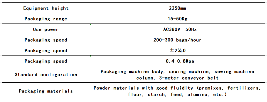 This product consists of a sack breaker, a bag entrainment device, a filling device, a weighing control system, a bag sewing machine, and a conveyor.